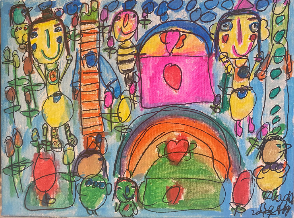 Der Prinz und die Prinzessin im Garten oder vor ihrem Schloss oder mit Freunden auf der Blumenwiese... Fröhlicher geht es nicht. Die farbenfrohen Bilder von Betty Feix machen einfach gute Laune und sind im Genre Art Brut schon ein Geheimtipp (Malerin im VIA Atelier Blumenfisch).